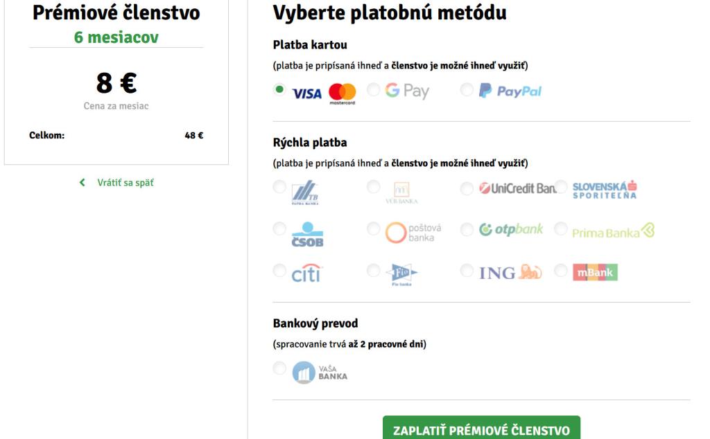Rýchlosť aktiváce záleží na spôsobe platby, ktorý si pre úhradu prémiového členstva zvolíte. U platby platobnou kartou sa prémiové členstvo aktivuje behom pár minút (desiatok minút), pri bankovom prevode za 2-3 pracovné dni.